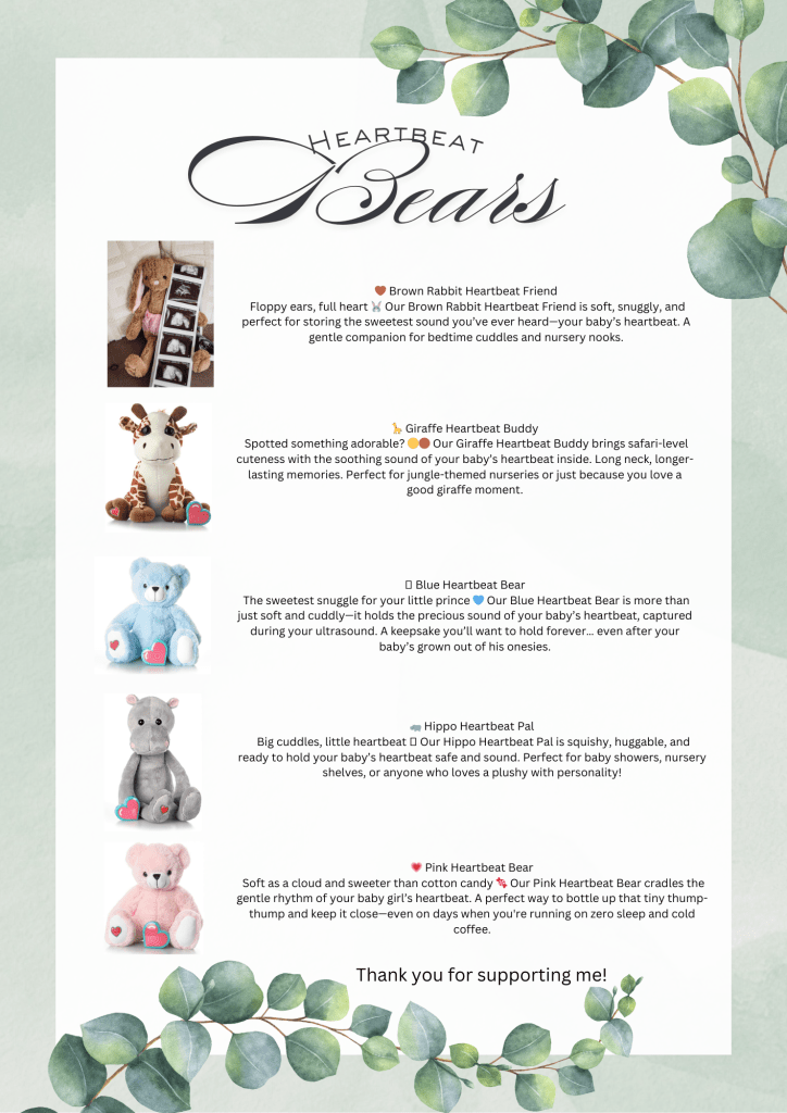 Our Heartbeat Animals let you do just that—soft, adorable plush companions with a special recording of your baby’s heartbeat captured during your ultrasound. Each one is a cuddly keepsake made to treasure, hug, and swoon over for years to come.